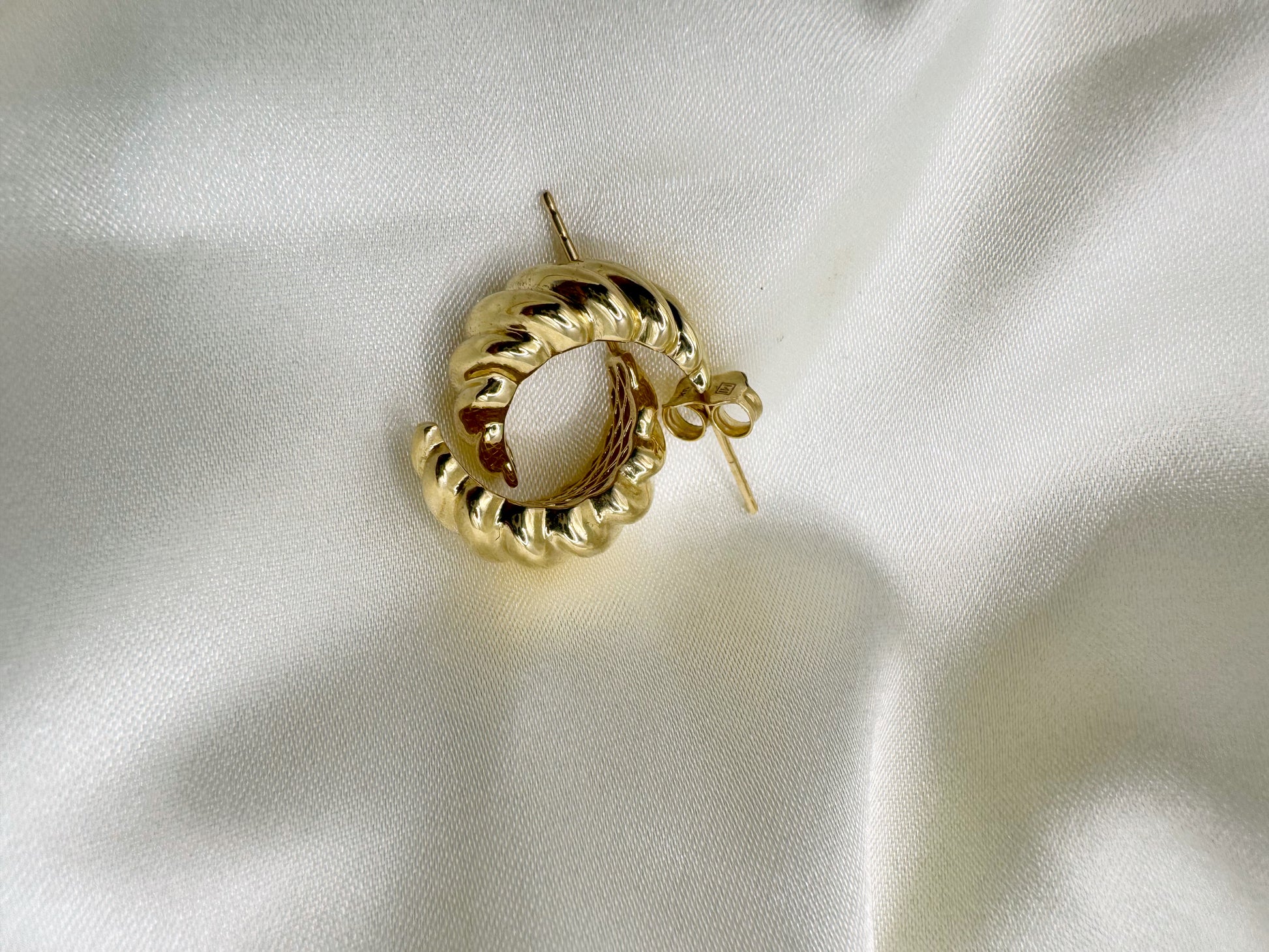 14k Italian gold chunky croissant style huggie with a push back closure. Adds great texture and style to any stack or can absolutely stand alone!