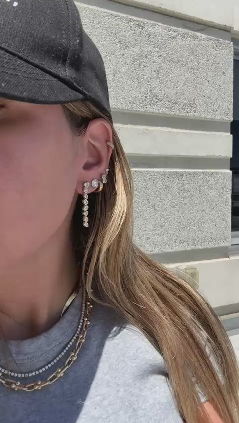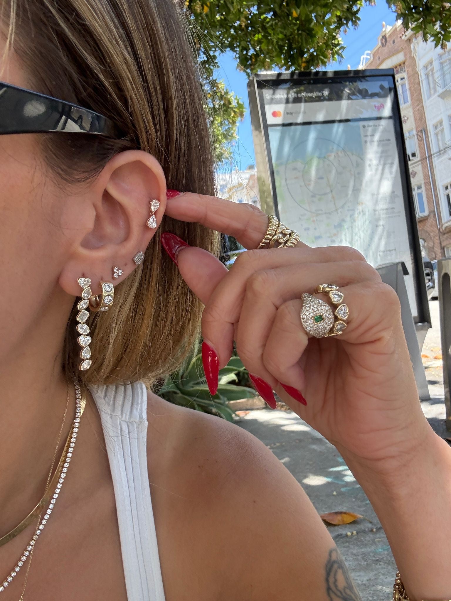 Sorry - couldn’t pick a favorite shape so we used them all. Literally. These earrings have 2cttw of colorless lab grown diamonds (heart, pear, marquise, oval and emerald cut) bezel set into 14k yellow gold. Can be customized to 14k white or 14k rose also!