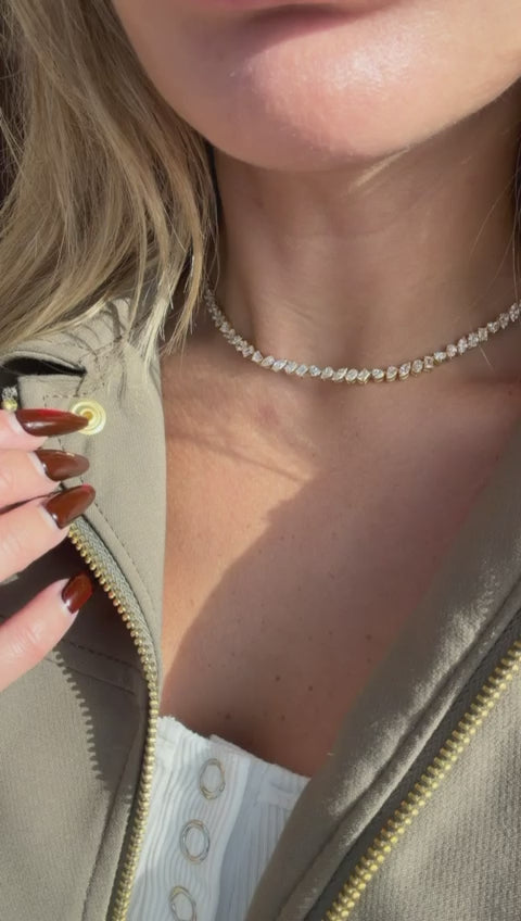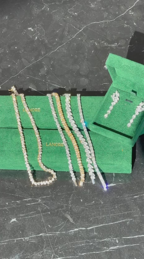22ctw of colorless, VS clarity lab grown diamonds in all of your favorite shapes (marquise brilliant, heart brilliant, pear brilliant, oval brilliant, emerald cut) 14k yellow gold, with a length of 16".